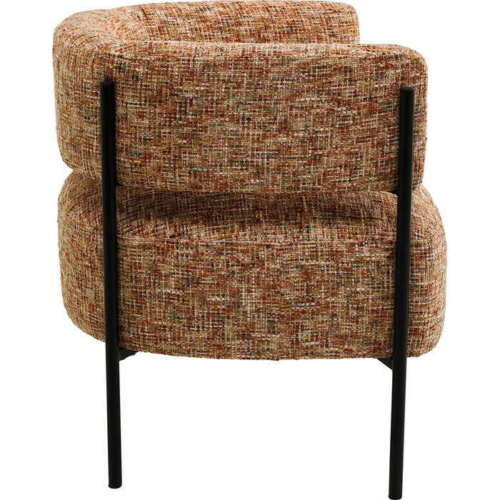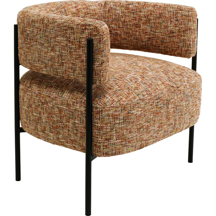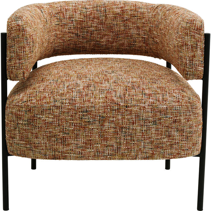 This cocktail chair adds a touch of lounge flair to any room: an elegant fabric with a soft mélange in warm earth tones envelops the curved upholstery and creates subtle color effects. The delicate metal base in black lends airy elegance while ensuring reliable stability. Thanks to the generous upholstery and flexible strap suspension, every moment becomes a relaxed pleasure—from a convivial aperitif in the living room to a styling break in the dressing area. As a solo piece next to a wooden side table or in a duo in front of a desk, it makes a stylish statement with guaranteed comfort.