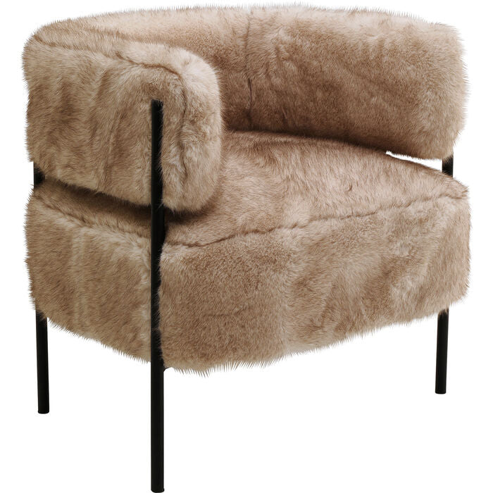 A touch of chalet flair meets urban style: this armchair impresses with its fluffy surface in soft natural tones and an organic silhouette that immediately radiates comfort. The slim black metal base contrasts excitingly with the soft feel and creates a sense of visual lightness. Whether as an elegant accent in the living room, next to the dressing table in the bedroom, or as a casual reading chair, this gem is sure to attract attention. The upholstered seat and flexible base promise relaxed lounging in style. The design is particularly harmonious when combined with warm lighting, wooden elements, or graphic prints.