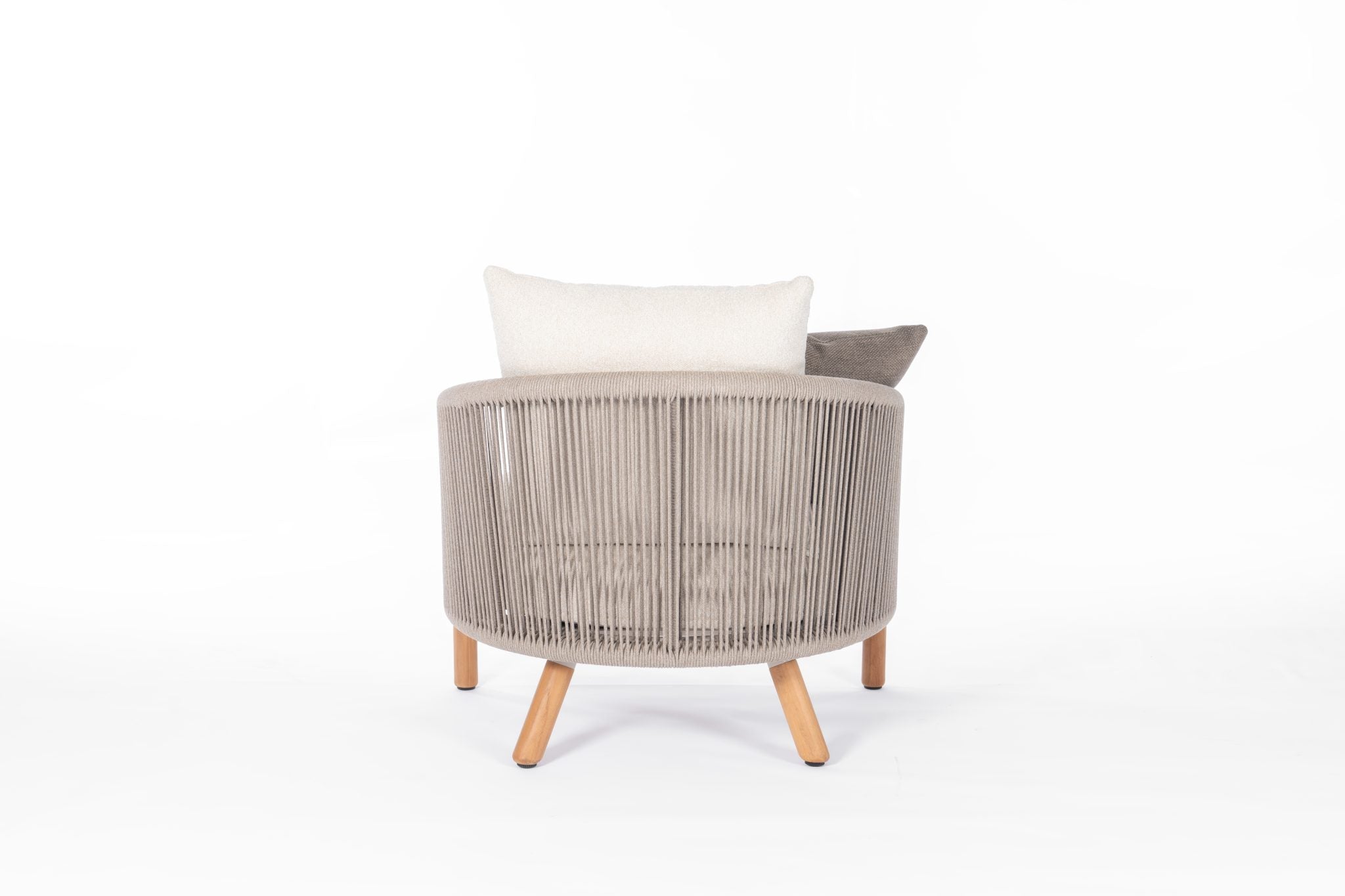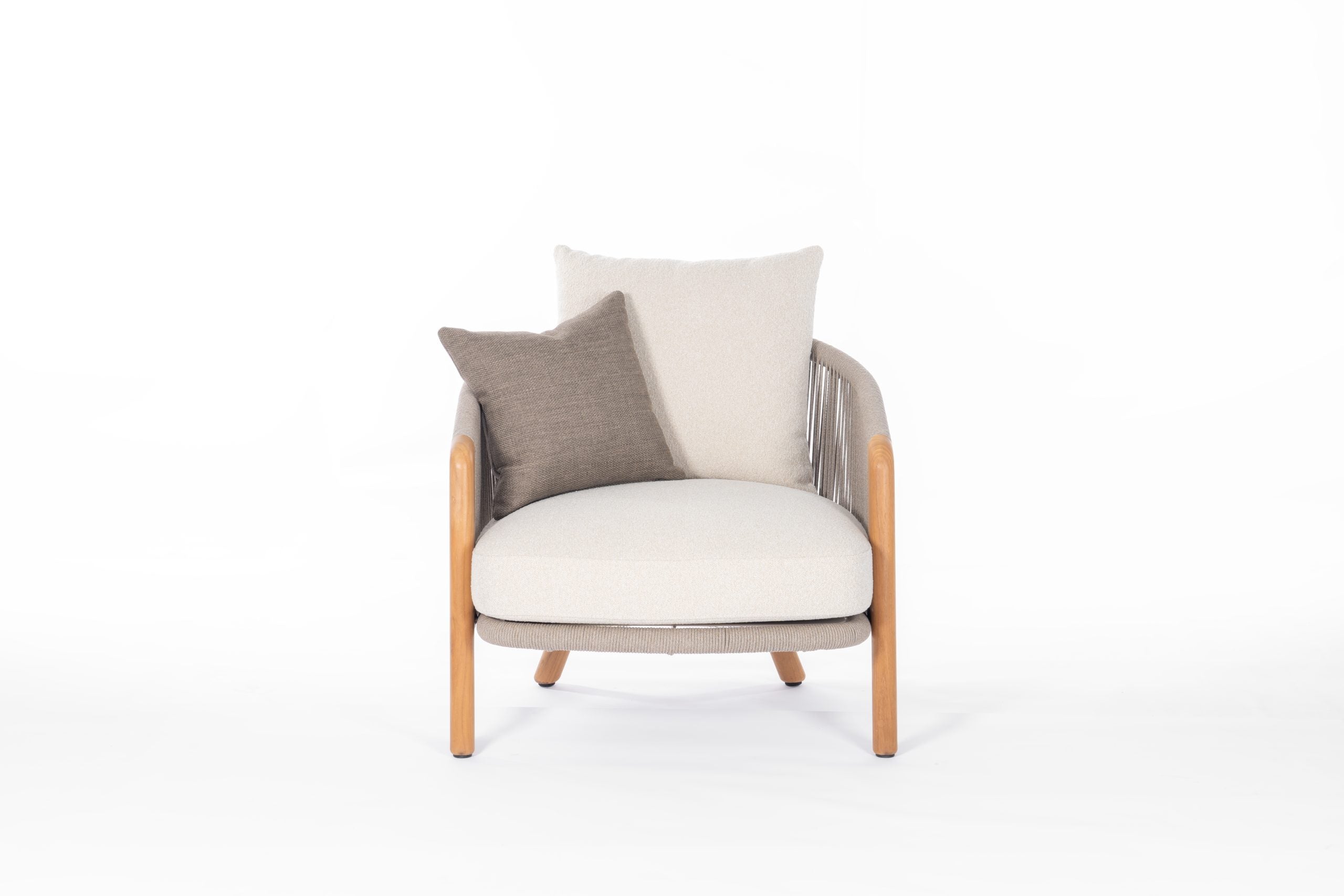 - Aluminum Mocha Frame, Upholstered in Mocha Fabric, 6mm Olefin Mocha Rope Back, With FSC Teak legs, 1 Cushion.
