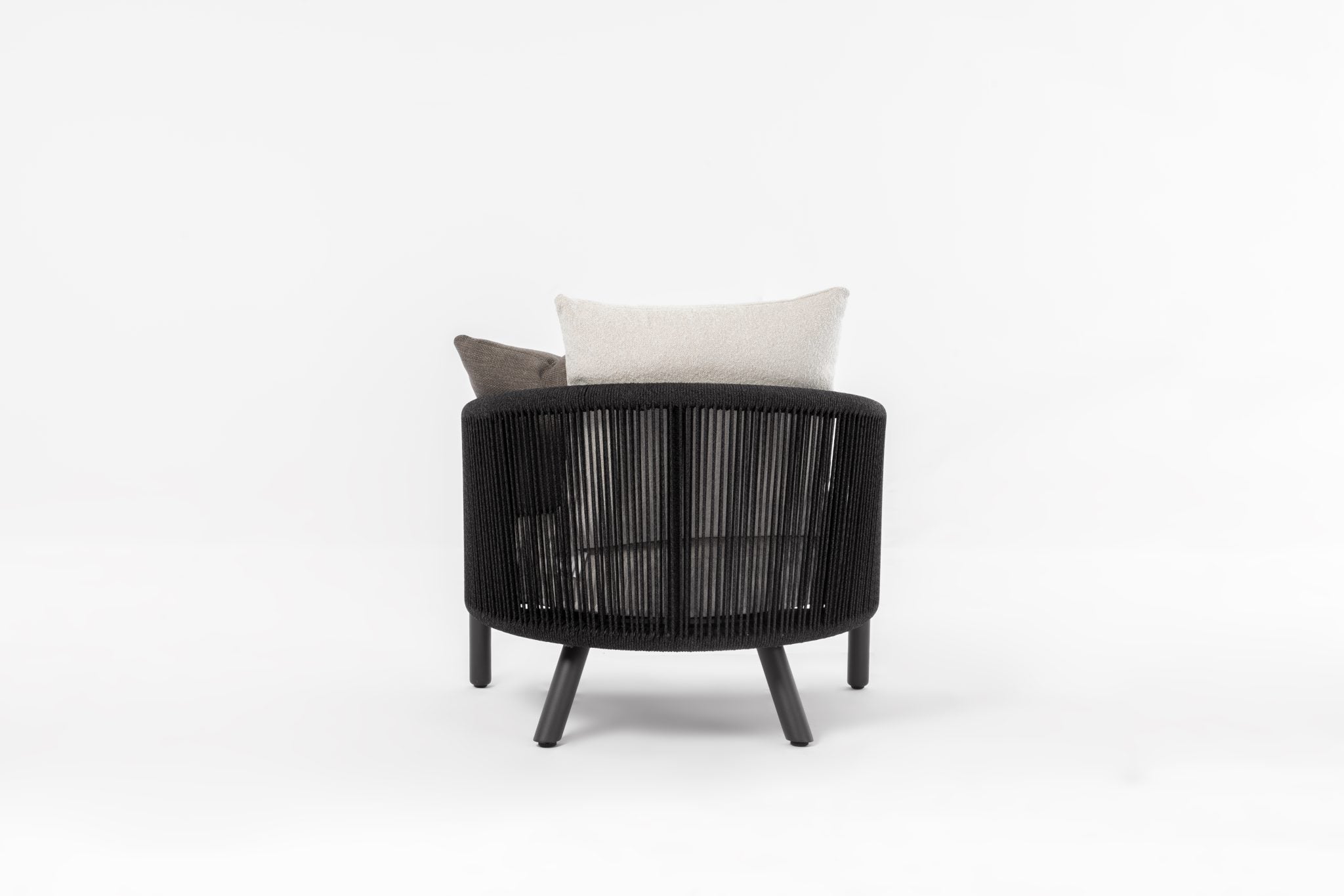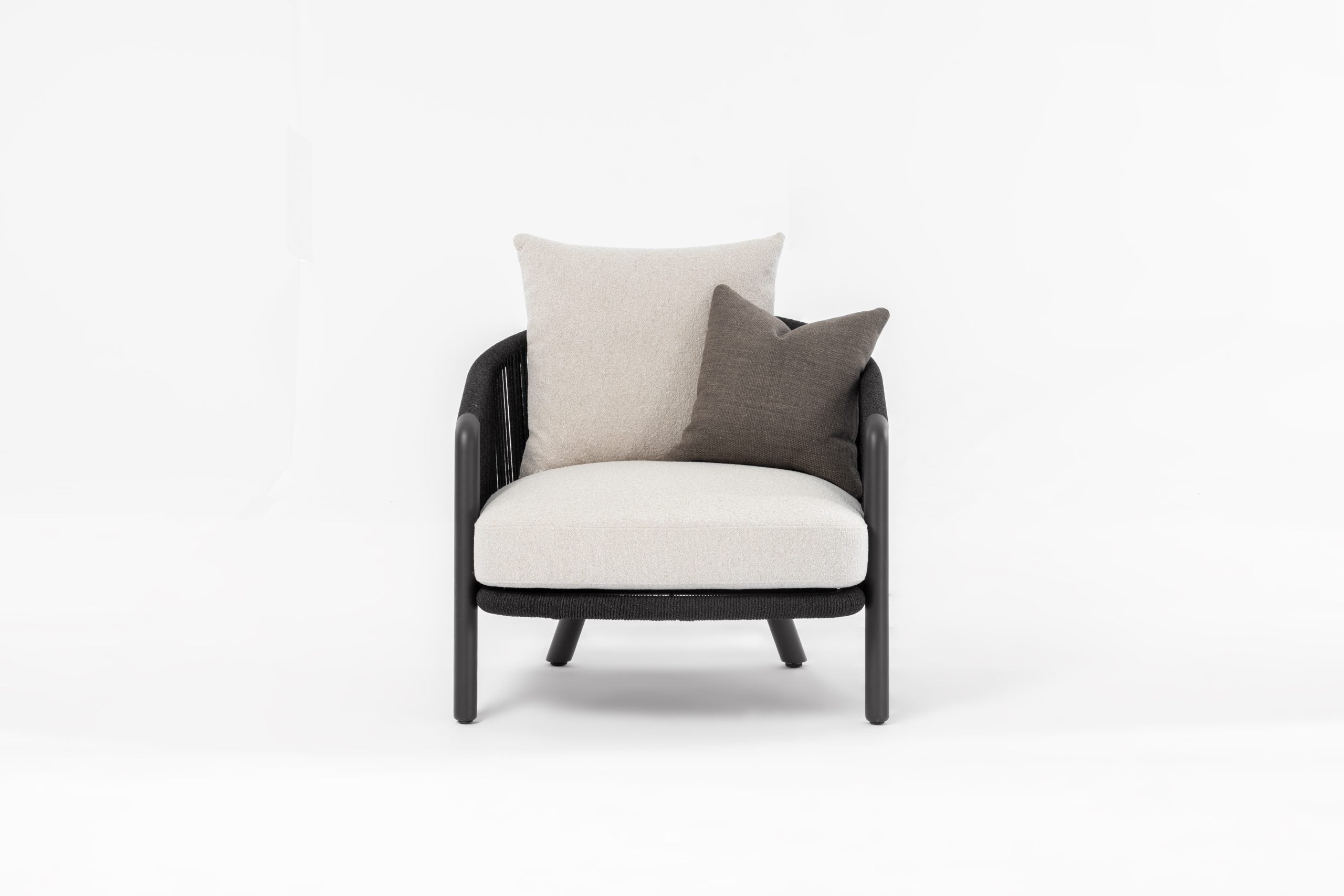 - Aluminum Charcoal Frame , Upholstered in Light Grey Fabric MH-1763, 6mm Olefin Black Rope Back , 1 Cushions 40x40cm, 1 Cushion 30x50cm.