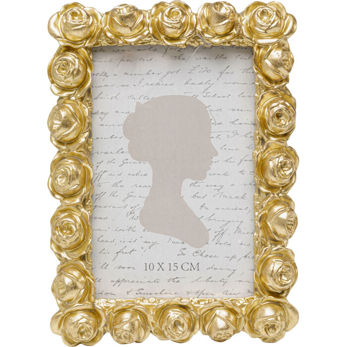 A touch of romance in gold: this artistically decorated picture frame brings a playful elegance to your home with its delicate rose ornaments and elegant finish. The finely modeled flowers provide a stylish frame for your favorite photos and skillfully showcase your memories—whether as part of an atmospheric picture gallery or as a solo star on a dresser, windowsill, or desk. In a shiny gold tone, this decorative accessory blends effortlessly into glamorous interiors and adds charming highlights when mixed with vintage objects, floral prints, or elegant metallic tones. A small gem with a big impact.