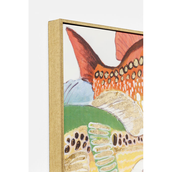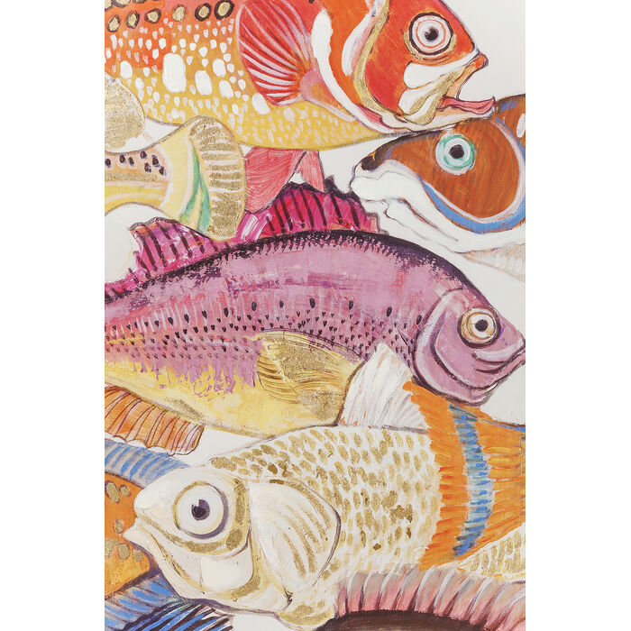 A breath of sea air for your walls: this two-piece set brings maritime flair into your home with colorful fish motifs, shimmering gold accents, and an artistic brush texture. The two pictures exude lightness and good cheer—perfect for freshening up dull walls. Whether hung side by side or placed individually, they create a lively interplay of color and form reminiscent of summer coastal resorts. Framed in natural wood, the hand-painted canvases look particularly authentic. Combined with linen fabrics, light wood, and accessories in shades of blue, they create a harmonious interior with a holiday feel. A real highlight for anyone looking for something special.