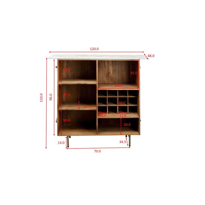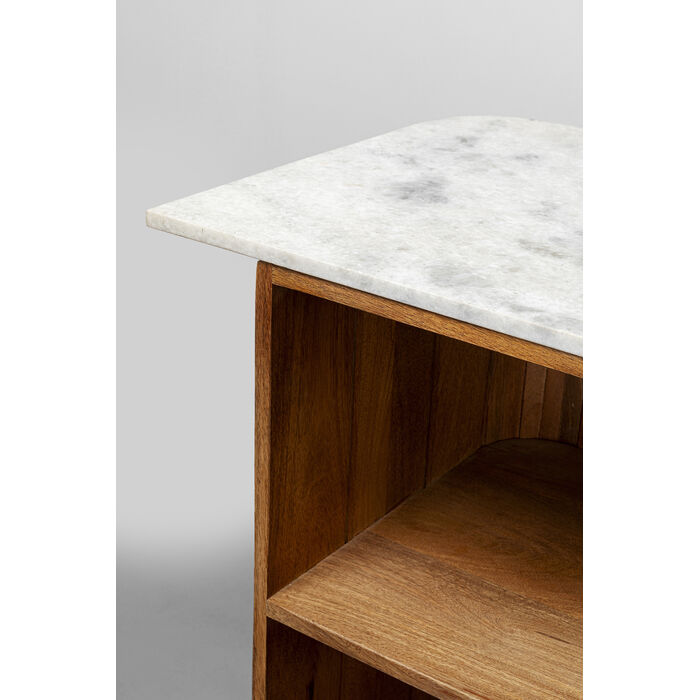 Material: Corpus and fronts: Mango Solid wood Stained-lacquered, Cover plate: Marble, Worktop: Medium density fibreboard (MDF) Lacquered, Foot/Base: Steel powder-coated, Shelf: Mango Solid wood Stained-lacquered, Worktop: 25 kg Max. load-carrying capacity, Shelf: 15 kg Max. load-carrying capacity, 15 mm Thickness of panel, Hand-crafted, Each peace unique, Floor glides: Adjustable in height, Partly dismantled, FSC certified
