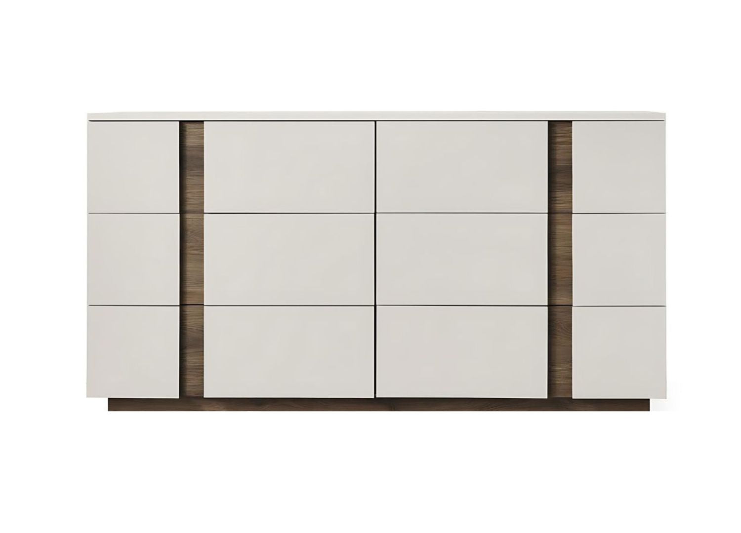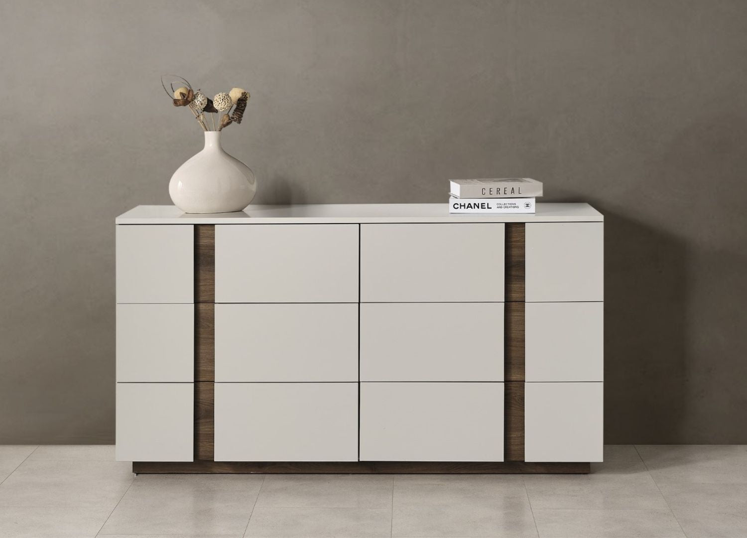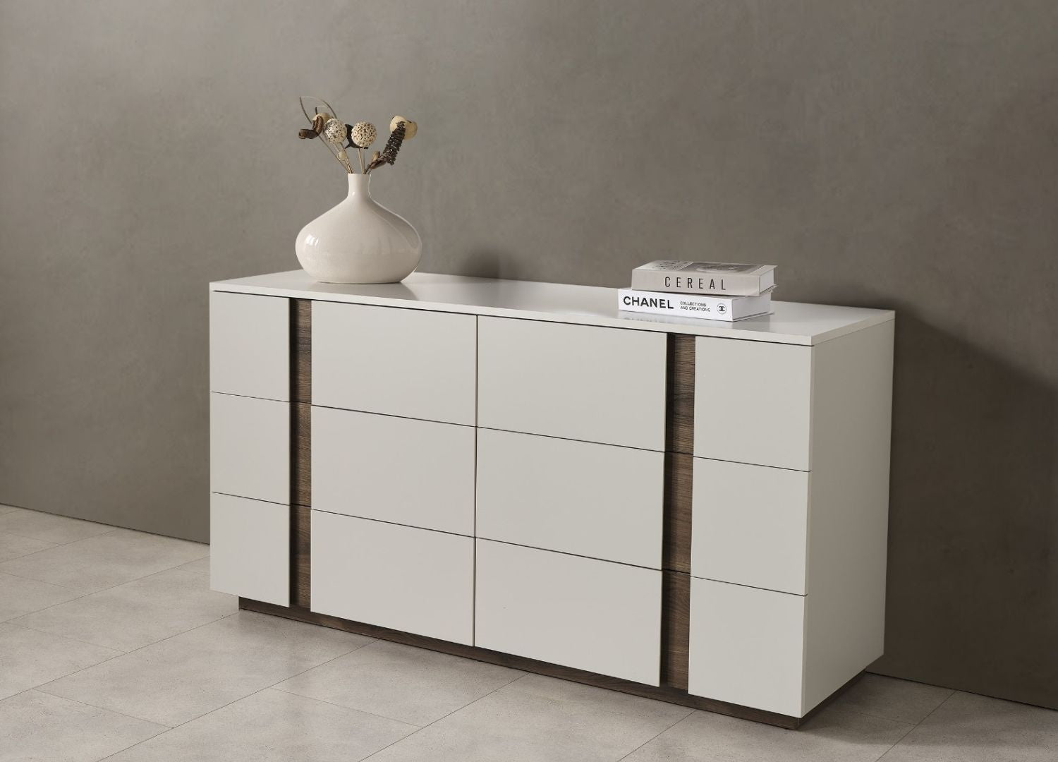 Romina Dresser, Light Grey Lacquer, 6 Self-Closing Drawers with Inner Handles in Walnut Veneer.