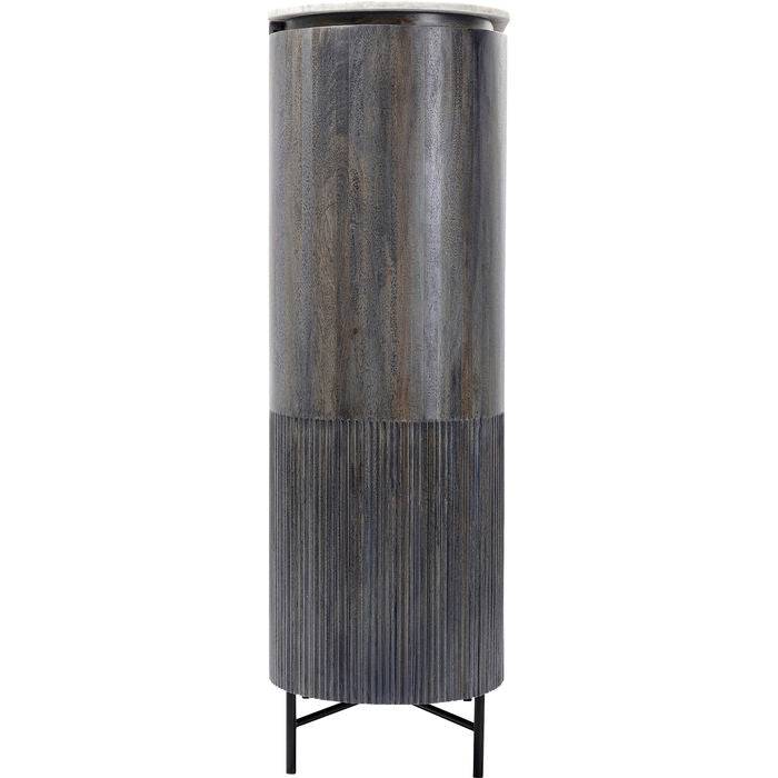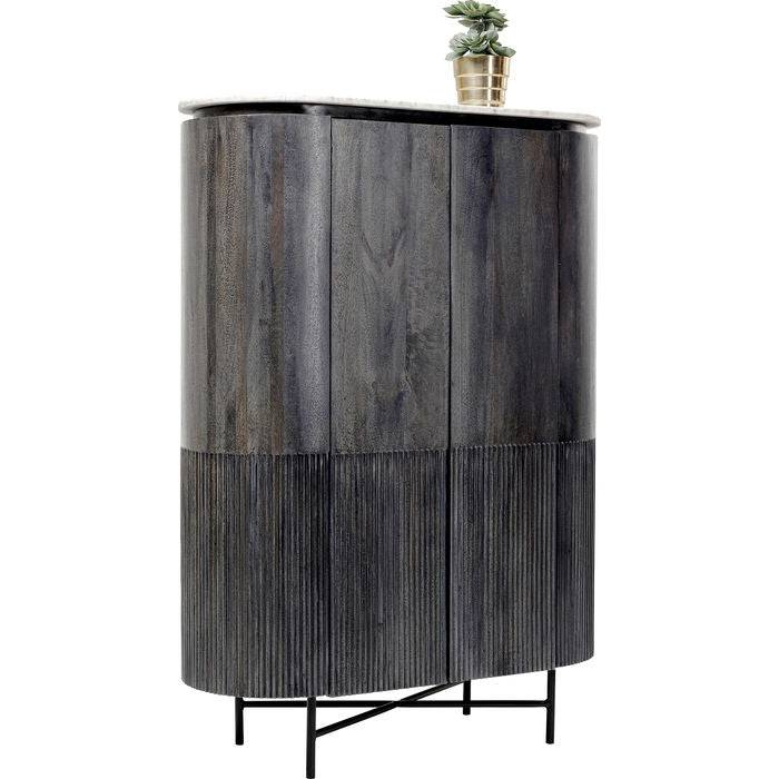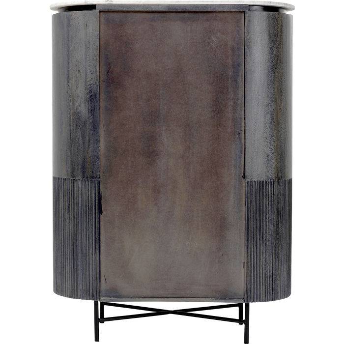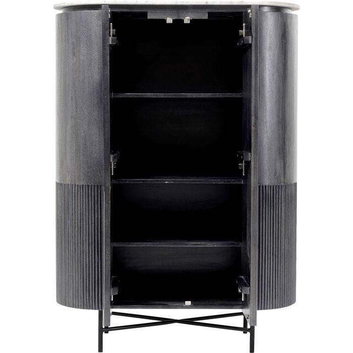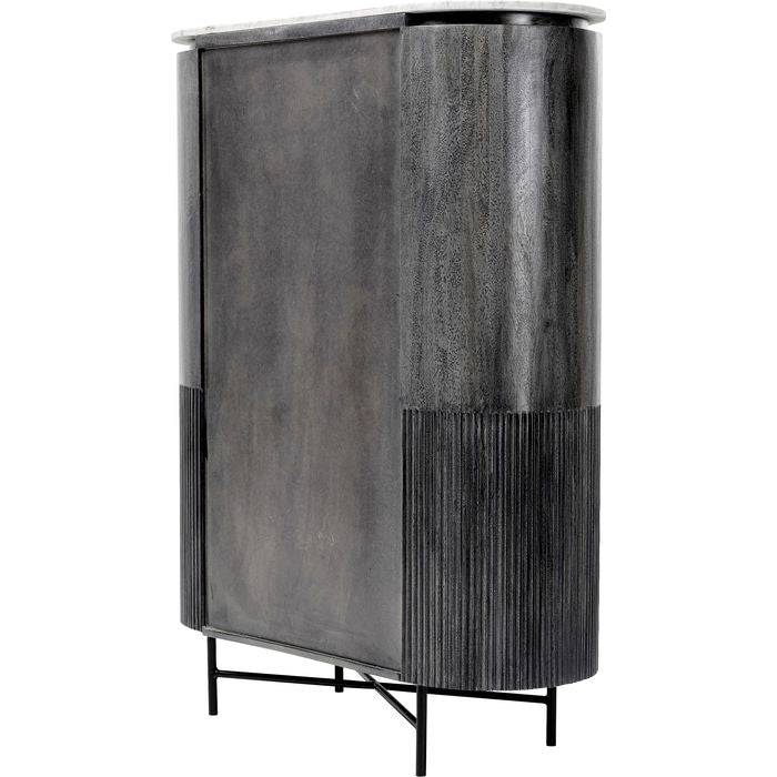 Noble and special - this tall cabinet wants more. The shape: a flat oval, the shelf made of light, genuine marble and a body that stands out among the living room cabinets with dark gray fronts and sides made of solid wood in a smooth and grooved look. Glenn radiates discreet nobility and timeless elegance and convinces with valuable materials and a variety of uses. Material: (body: solid mango wood lacquered, front: solid mango wood lacquered, back panel: medium density fiberboard lacquered, cover plate: marble, foot/feet: steel powder coated, shelf: medium density fiberboard lacquered)