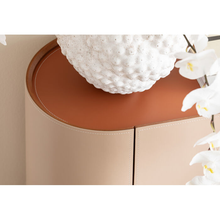 The stylish combination of cool beige and orange tones and high-quality fabric upholstery makes this cabinet an elegant eye-catcher in any room. The fine white contrast stitching and delicate steel frame add that special something and create modern accents. Behind the hinged door, three compartments offer flexible storage space for everything that needs to be stored stylishly – whether in the hallway, bedroom, or living room. A piece of furniture that not only creates order but also makes a design statement in any home!
