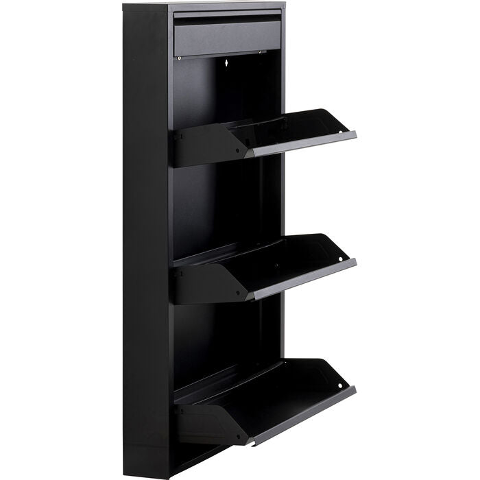 Clever design meets functionality! This slim shoe rack made of black metal combines minimalist chic with practical refinement. Three tilting compartments provide space for at least six pairs of shoes, while an additional drawer offers a stylish hiding place for small everyday items such as keys or headphones. Its slender format makes the shoe tipper the perfect solution for narrow corridors or small rooms. Combined with a modern mirror and a discreet coat rack, it will become a stylish highlight in the entrance area.