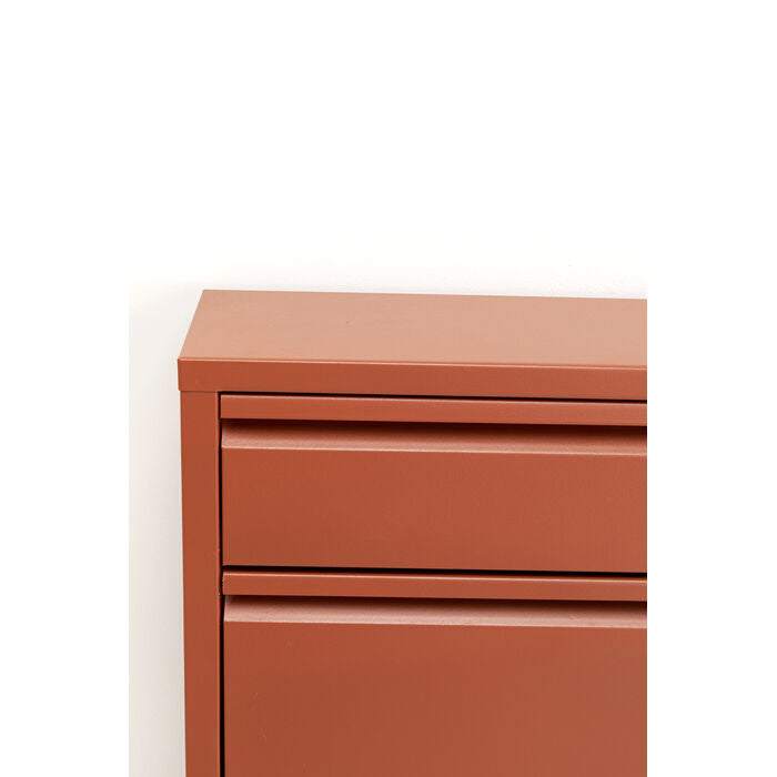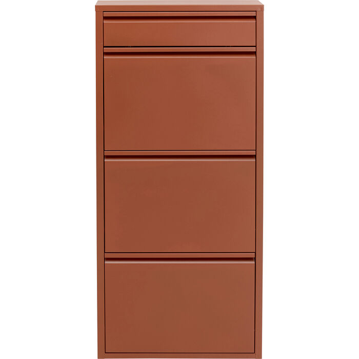 Clever design meets functionality! This narrow metal shoe tipper in warm rust-brown combines minimalist chic with practical sophistication. Three tilting compartments offer space for at least six pairs of shoes, while an additional drawer provides a stylish hiding place for small everyday items such as keys or headphones. The slimline format makes the shoe tipper the perfect solution for narrow hallways or small rooms. Combined with a modern mirror and discreet wall hooks, it becomes a stylish highlight in the entrance area.