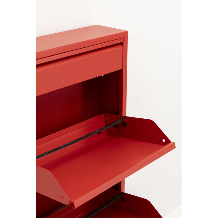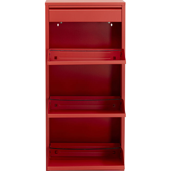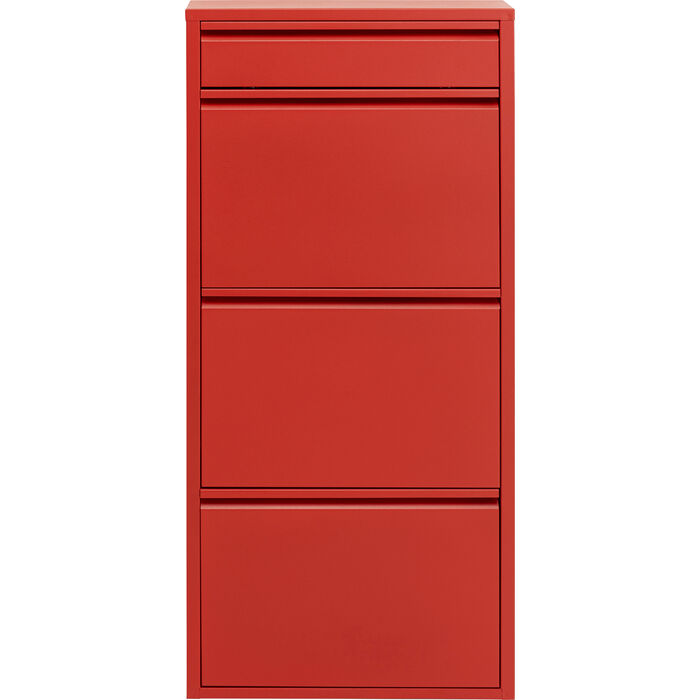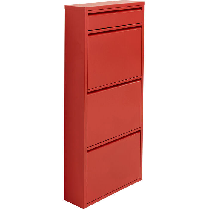 Clever design meets functionality! This narrow metal shoe tipper in bright red combines minimalist chic with practical sophistication. Three tilting compartments offer space for at least six pairs of shoes, while an additional drawer provides a stylish hiding place for small everyday items such as keys or headphones. The slimline format makes the shoe tipper the perfect solution for narrow hallways or small rooms. Combined with a modern mirror and discreet wall hooks, it becomes a stylish highlight in the entrance area.