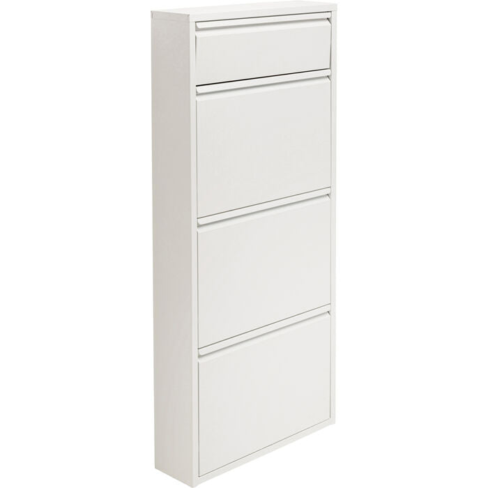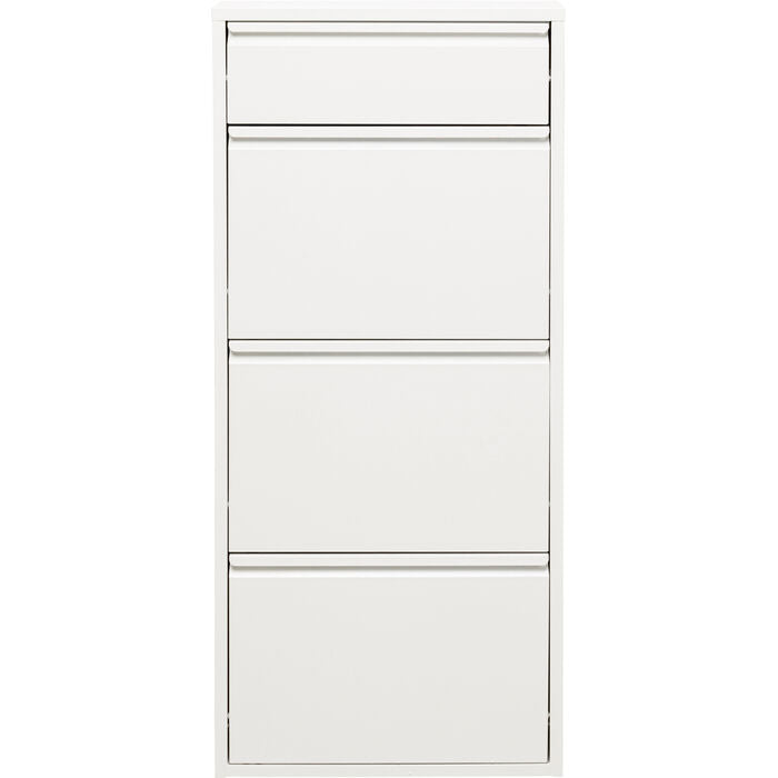 A real all-rounder with style! The white metal shoe tipper features a slim design and clever functionality. Three tilting compartments provide ample space for at least six pairs of shoes, while the upper drawer neatly stores small items such as keys or cables. Whether you place it in the hallway, the bedroom or even the basement, its versatility makes it an indispensable helper. Combined with a rug or artificial plants, it will create a harmonious interior ambience.