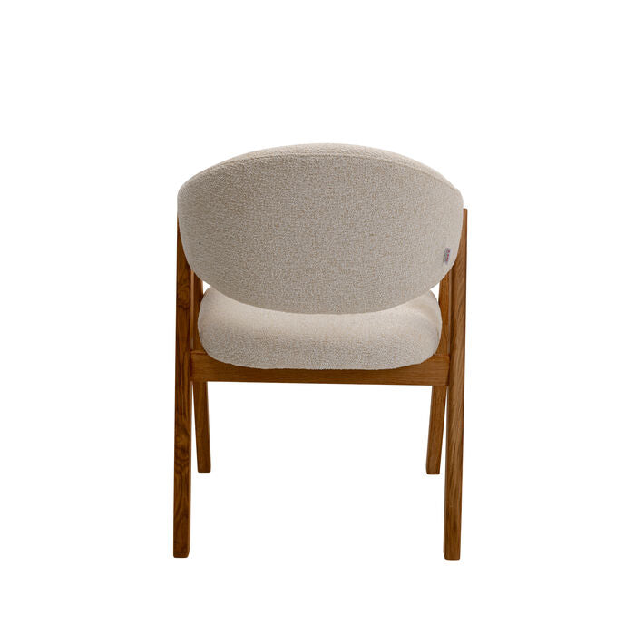 This Scandinavian-style armchair combines soft shapes with natural materials. The bouclé cover in brilliant white gives it a sophisticated touch, while the oiled oak frame provides stability and warmth. The ergonomic shape and comfortable upholstery invite you to spend relaxing hours at the dining table, in the home office or in the lounge. Perfect for minimalist living concepts or as a stylish contrast to bold colours - a design highlight with a feel-good factor.