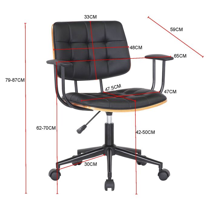 Compact comfort meets minimalist design - this office chair perfectly balances style and function. The combination of black leather-look cover and elegant silhouette makes it a smart eye-catcher in the home office or creative workspace. The soft upholstered seat ensures comfortable working without weighing down the look. The model looks particularly exciting in combination with wooden tables, graphic rugs or minimalist shelving systems. Whether as a contrast to bright colors or as a complement to industrial elements - this swivel chair proves that working comfort can also be visually appealing.