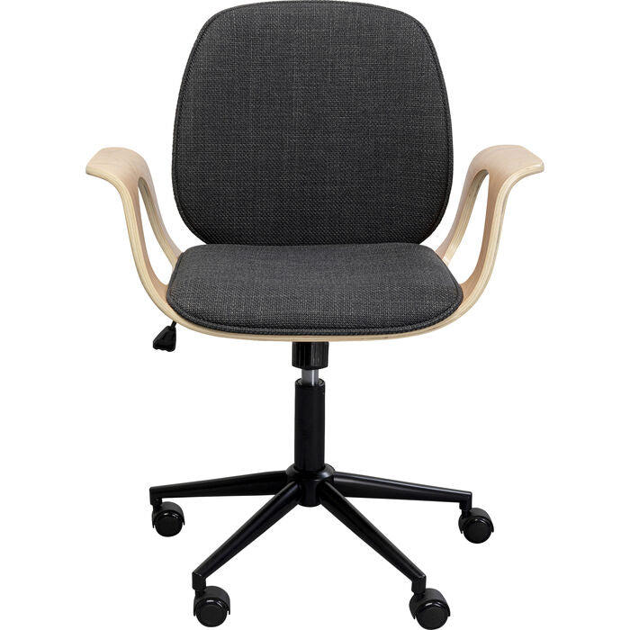 This office chair combines Scandinavian clarity with urban elegance - a real statement in the working environment. The seat shell made of steam-bent solid poplar wood gives the chair a natural warmth, while the mottled fabric cover in gray adds a modern touch. The matt black metal frame ensures stability and timeless aesthetics. Ideal for home offices or creative workspaces, this chair blends seamlessly into various interior styles. Combined with a minimalist desk and an industrial-look floor lamp, it creates a harmonious overall look that is both functional and stylish. An office chair that not only offers comfort, but also enriches the room design.