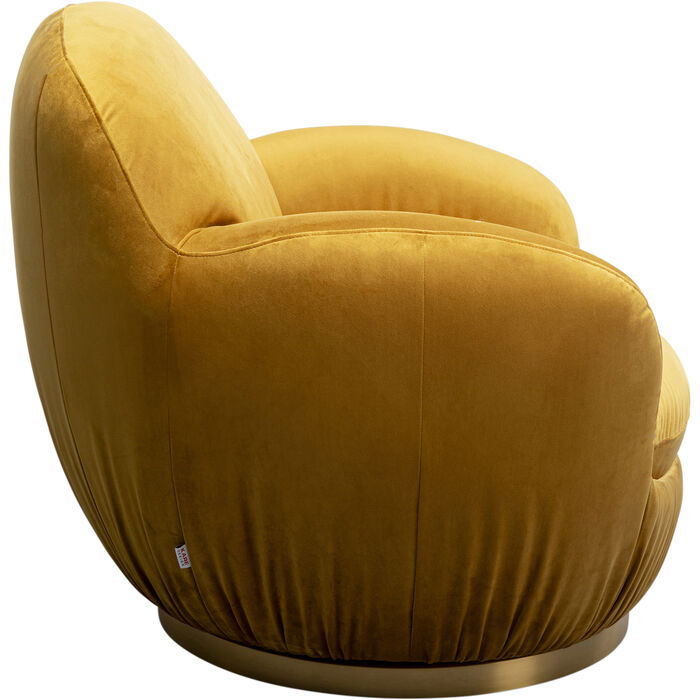 Yellow is the new interior colour, because it brings eternal sunshine into your own four walls. The lavishly crafted cover of this round armchair has a velvety shimmer. The design of the armchair is reminiscent of the glamorous times of old Hollywood movies and will add a touch of glamour to the living room. The armchair is built on a sturdy solid wood frame and features no-sag springing and foam padding for a high level of seating comfort.