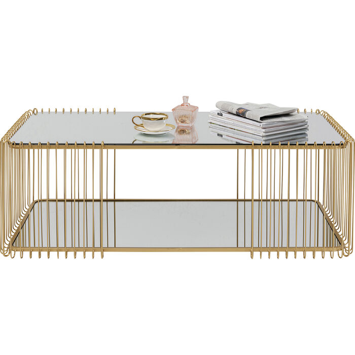 A luxurious addition to any sofa: this coffee table impresses with its clear, rectangular design and delicate steel frame. The two elegant table tops made of reflective safety glass offer double storage space for remote controls, magazines, drinks or decorative objects. With its sleek, minimalist design in gold, it fits seamlessly into any interior and harmonizes perfectly with sofas in different colors and materials.