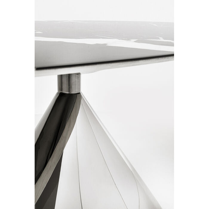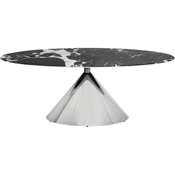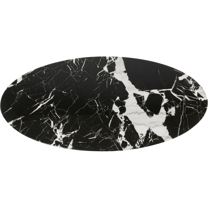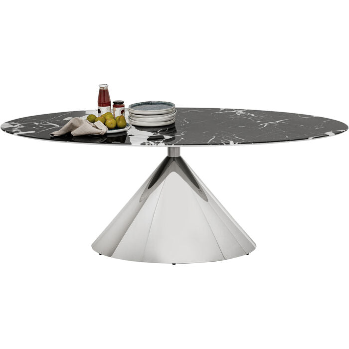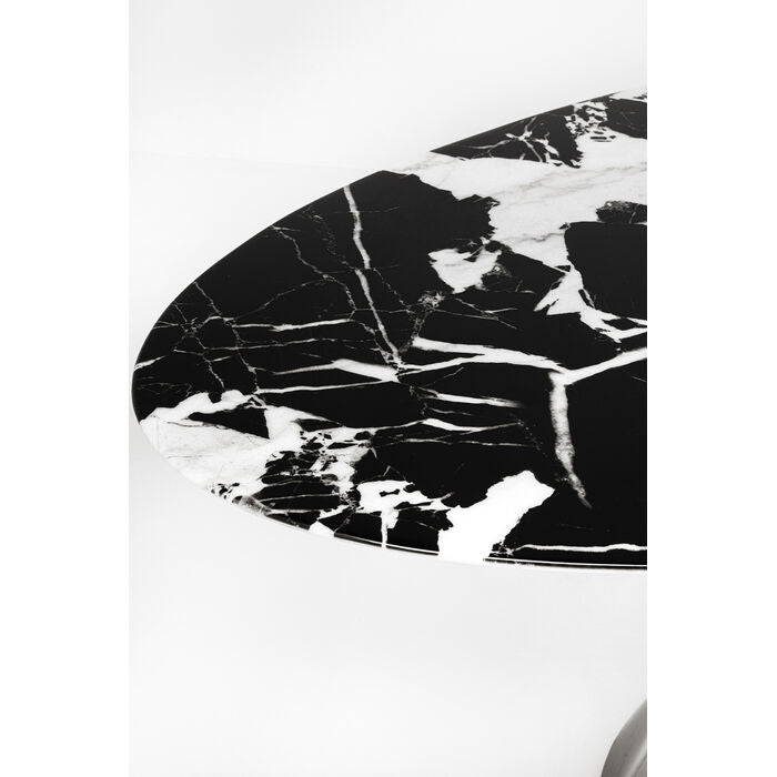 Elegance meets modern design - this marble-look dining table with a chrome-coloured stainless steel base will be the centrepiece of any dining room. The oval table top with its elegant polyresin coating creates a luxurious look that is both easy to clean and hard-wearing. The shiny base made of high-quality stainless steel brings geometric clarity and urban charm. Ideal in modern lofts, elegant townhouses or minimalist dining areas, this table adds structure and style to the room. Combined with clean, modern chairs or softer textiles, it creates a harmonious balance between luxury and comfort. Space for socialising and stylish dinners!