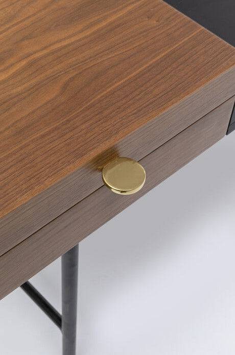 Material: Frame: Steel powder-coated, Tabletop: Medium density fibreboard (MDF) Lacquered, Walnut Plywood Veneered, Handle: Steel brass-plated, Glass Mirrored, 70 kg Max. load-carrying capacity, Delivery Knocked-down,