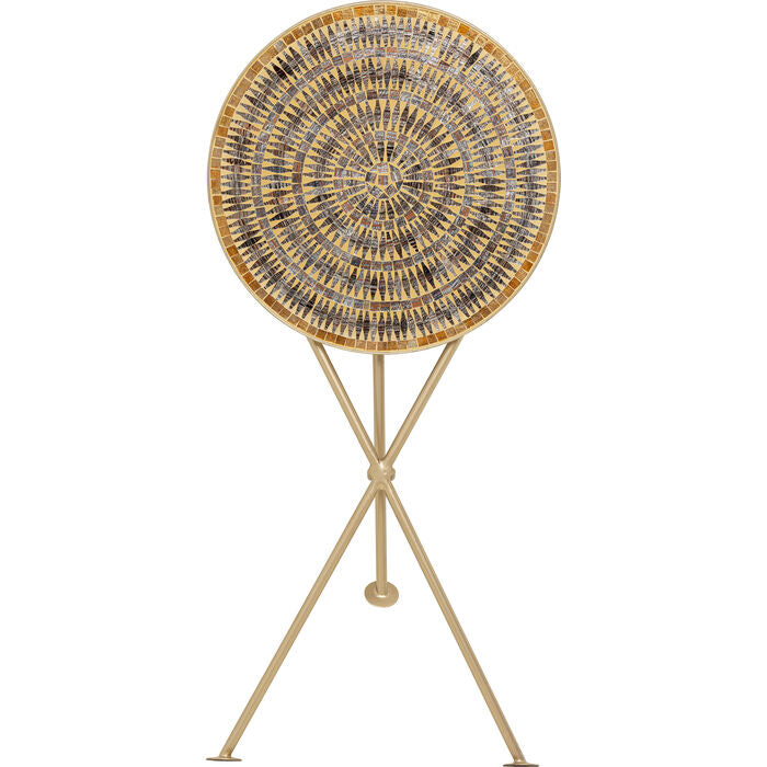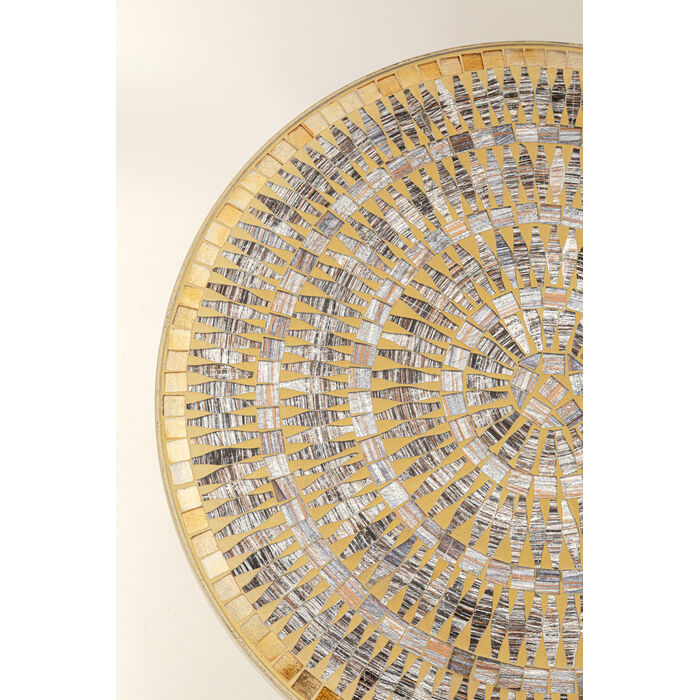 A work of art with function: this table brings color, texture and sophistication to any room. The glossy surface made of artfully crafted glass mosaic gives the ensemble a fascinating shimmer depending on the incidence of light - ideal for creating stylish accents. The golden steel frame adds an elegant touch and also scores points with its stability and clear design. Whether as an extravagant shelf next to the sofa, as an eye-catcher in the entrance area or as an unusual bedside table - this all-rounder can be flexibly integrated into the interior. Particularly practical: the foldable frame makes it a convertible favorite with a wow effect.