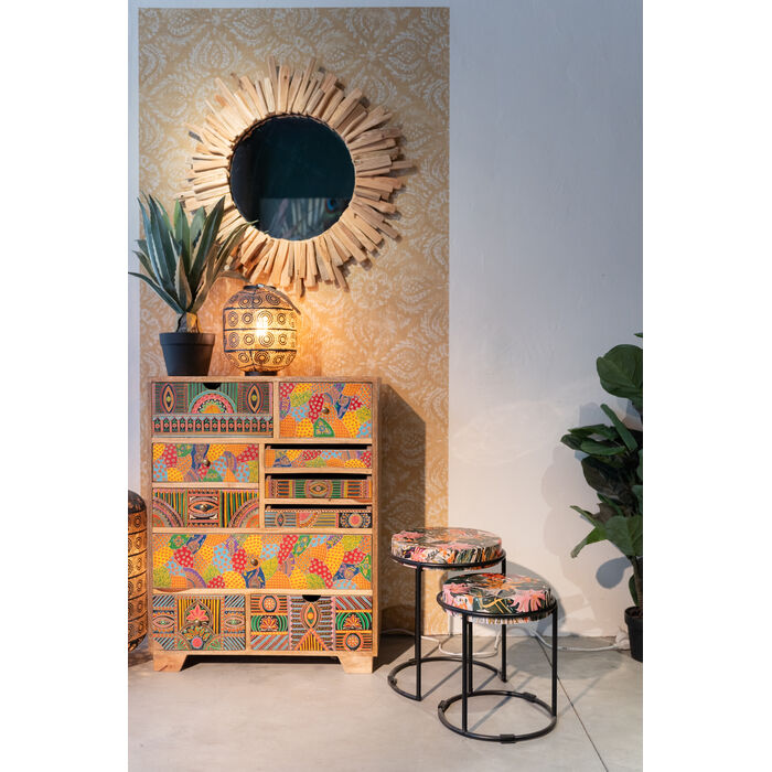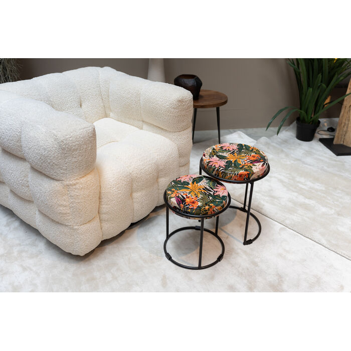 An urban jungle for the home: this set of 2 side tables with its tropical motifs lends any room a lively, exotic atmosphere. The black metal frames provide a modern contrast and guarantee stability and easy maintenance. Thanks to the varying heights, the tables can be used in a variety of ways - as a practical shelf next to the sofa or armchair, as a stylish bedside table or as a decorative highlight in the hallway. They are particularly effective in combination with natural materials and green plants, which stylishly complement the jungle flair. A must-have for anyone who wants to bring a sense of adventure into their interior.