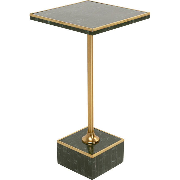 This small side table instantly adds glamour to your living room with its dark green tile look and delicate gold details. The sturdy metal frame ensures stability, while the polyresin surface makes the tabletop easy to clean and durable. Handcrafted and endowed with a unique character, it quickly becomes an eye-catcher next to the sofa or armchair. Whether as a practical storage space for accessories, drinks or small decorative items, it charmingly combines function and design and enhances any room with a touch of luxury, colour and playful elegance. A real highlight that instantly enhances style and atmosphere.