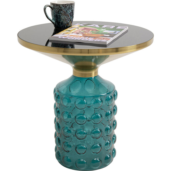 A real statement piece for style-conscious interiors: this side table skilfully plays with shape, color and material. The blue glass frame is reminiscent of a sculptural art object and brings sunshine even into minimalist rooms. The black top made of safety glass offers plenty of storage space for your favorite decorative pieces or breakfast on the sofa. Gold-colored steel elements set elegant accents and add a touch of glamour. Whether as a soloist next to the lounge chair or in an ensemble with other design objects - this table gives modern living spaces a stylish upgrade with art gallery flair. Ideal for bold looks with character.