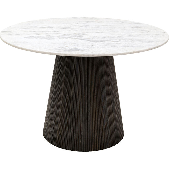 A dining table that masterfully combines elegance and naturalness: the round table top made of real marble brings a luxurious shine to the dining area, while the solid, dark-stained mango wood frame with its organic grain creates an exciting contrast. Thanks to its harmonious shape, it fits perfectly into modern, minimalist or luxurious living concepts. Velvet chairs and gold accents create a glamorous look, while simple wooden chairs emphasize Scandinavian lightness. A real statement piece for stylish dinner evenings and social gatherings.