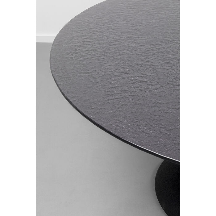 A round dining table with futuristic vibes: with this sculptural, all-black table, you are definitely bringing a modern statement piece of furniture into your home! The textured glass table top is a particular highlight of the design. It is made of toughened safety glass and stands out with its vibrant surface. This table can be used both as a garden table and as a dining room table. When using it on the patio or balcony, please protect the dining table from moisture, waterlogging and wind. The extravagant base made of powder-coated aluminium completes the look. The black colour also adds an exciting contrast to your living style. Depending on the seating arrangement, the round table offers space for approx. 6 people.