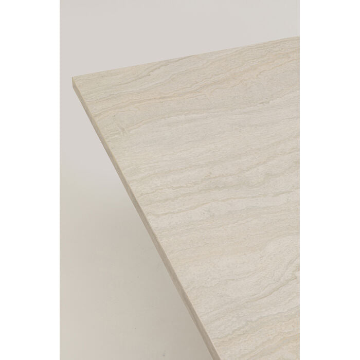 The furniture in our Travertino series combines minimalist design with the natural charm of an elegant stone finish. The open-pored surface impresses with a fine, lively structure that is reminiscent of real travertine, not only visually but also to the touch, and adds depth to the interior. Every angle reveals new nuances and unique grains in delicate beige tones – calm, warm, and wonderfully harmonious. Thanks to its special coating, the surface remains resistant to everyday wear and tear and is easy to clean. As a dining table, Travertino becomes a stylish centerpiece – spacious, inviting, and ideal for social gatherings with natural charm.