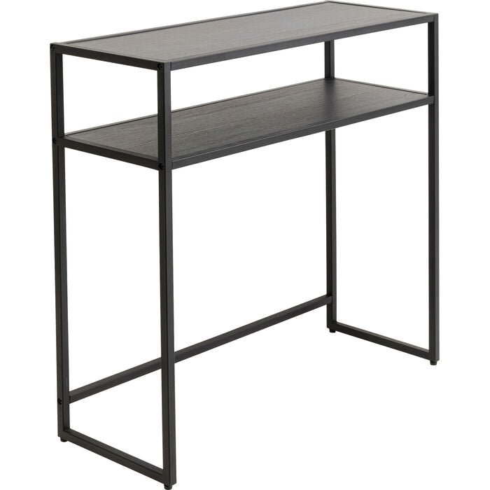Simple, functional and stylish: with its clean design and matt black frame, this modern console table brings urban flair to any living space. Two shelves made of black lacquered wood offer practical storage space for decorations, books or everyday items – while also adding a natural accent. Whether as an elegant shelf in the hallway, a minimalist dressing table in the bedroom or a stylish organisational aid in the dining area, this piece of furniture adapts effortlessly to different interior styles. Particularly sophisticated: thanks to its all-round successful design, the console also cuts an excellent figure as a free-standing piece.