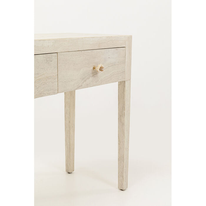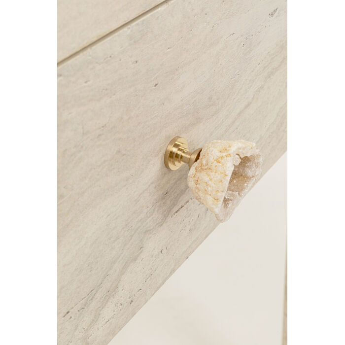 The furniture in our Travertino series combines minimalist design with the natural appeal of an elegant stone finish. The open-pored surface captivates with a fine, lively texture that is reminiscent of real travertine, both visually and haptically, and adds depth to the interior. Every angle reveals new nuances and unique grains in delicate beige tones – calm, warm, and harmonious. Thanks to a special coating, the surface remains resistant and easy to clean. Handles made of sparkling rock crystal geodes add a luxurious accent and symbolize clarity and balance. The slim console table with two drawers combines understated elegance with practical functionality and is ideal for the hallway, bedroom, or living area – as a storage unit, dressing table, or stylish organizer.