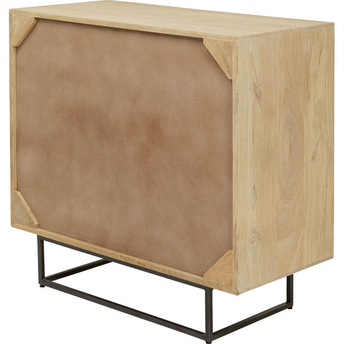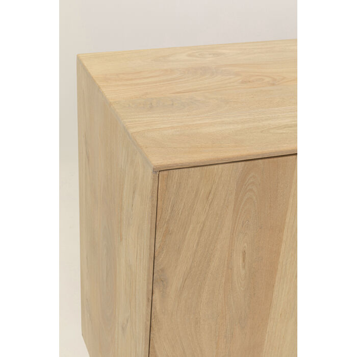 The Mulino range is characterized by its light, natural finish, which emphasizes the natural look of mango wood. The soft lacquered surface accentuates the individual wood grain and creates a modern, airy look. The relief-like front structure sets artistic accents, while filigree steel legs create an exciting mix of materials. In addition to the aesthetic effect, practical, stylish storage space is created - perfect for a tidy home with design aspirations. Ideal for Scandinavian, minimalist or boho-inspired living styles, harmonizes with soft earth tones, contrasting black or metallic highlights for a stylish, inviting ambience.
