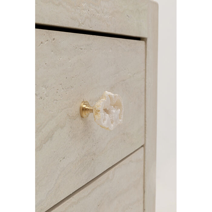The furniture in our Travertino series combines minimalist design with the natural appeal of an elegant stone finish. The open-pored surface captivates with a fine, lively structure that is reminiscent of real travertine, not only visually but also haptically, and brings depth to the interior. Every angle reveals new nuances and unique grains in delicate beige tones – calm, warm, and harmonious. Thanks to a special coating, the surface remains durable and easy to clean. Handles made of sparkling rock crystal geodes add a luxurious accent and symbolize clarity and balance. The small chest of drawers with two drawers and a soft-close function is perfect as a stylish bedside table or elegant side table – a versatile favorite with a refined character.