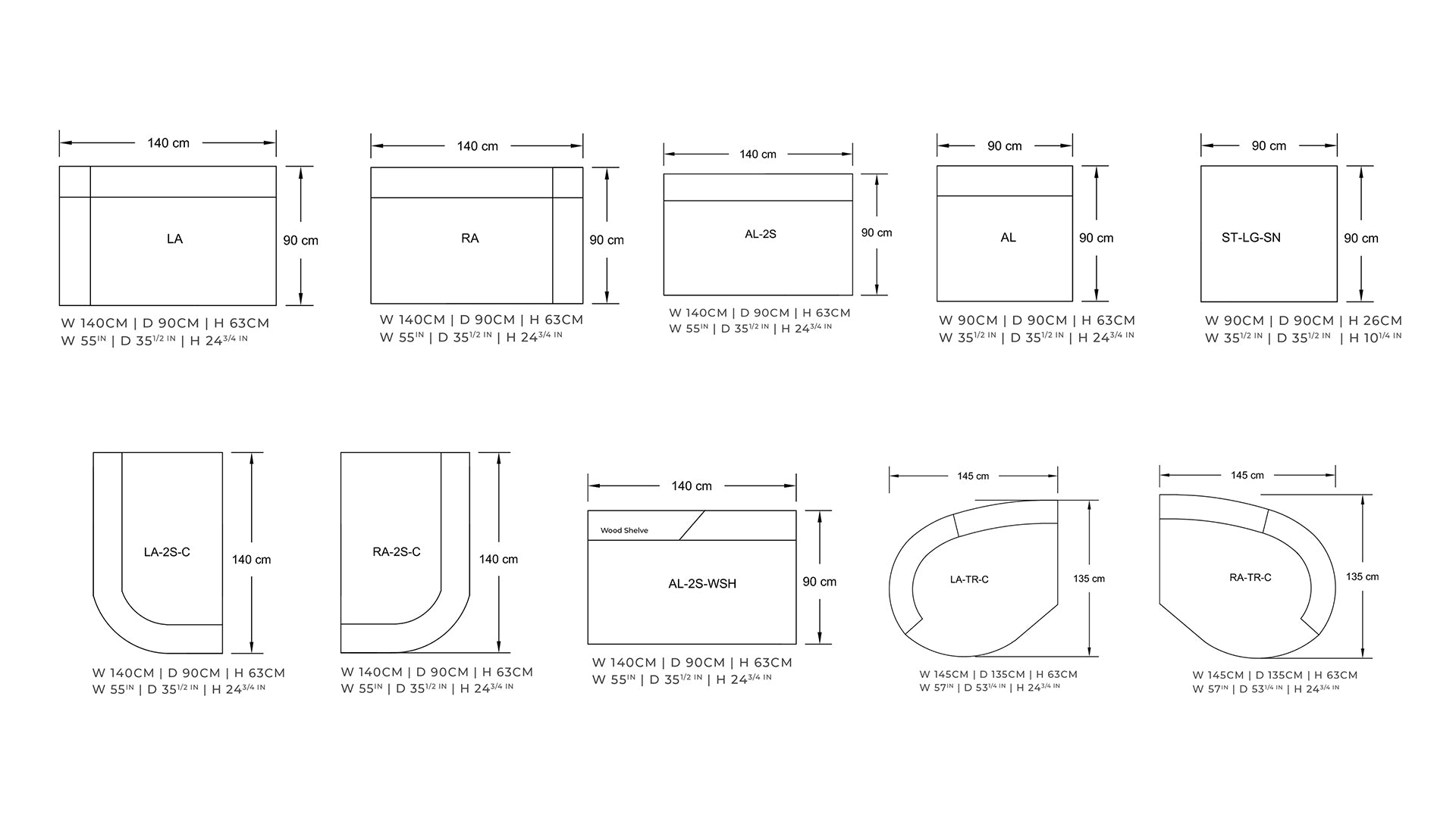 Arm Terminal Curved: 24 ¾" x 57" x 53 ¼"