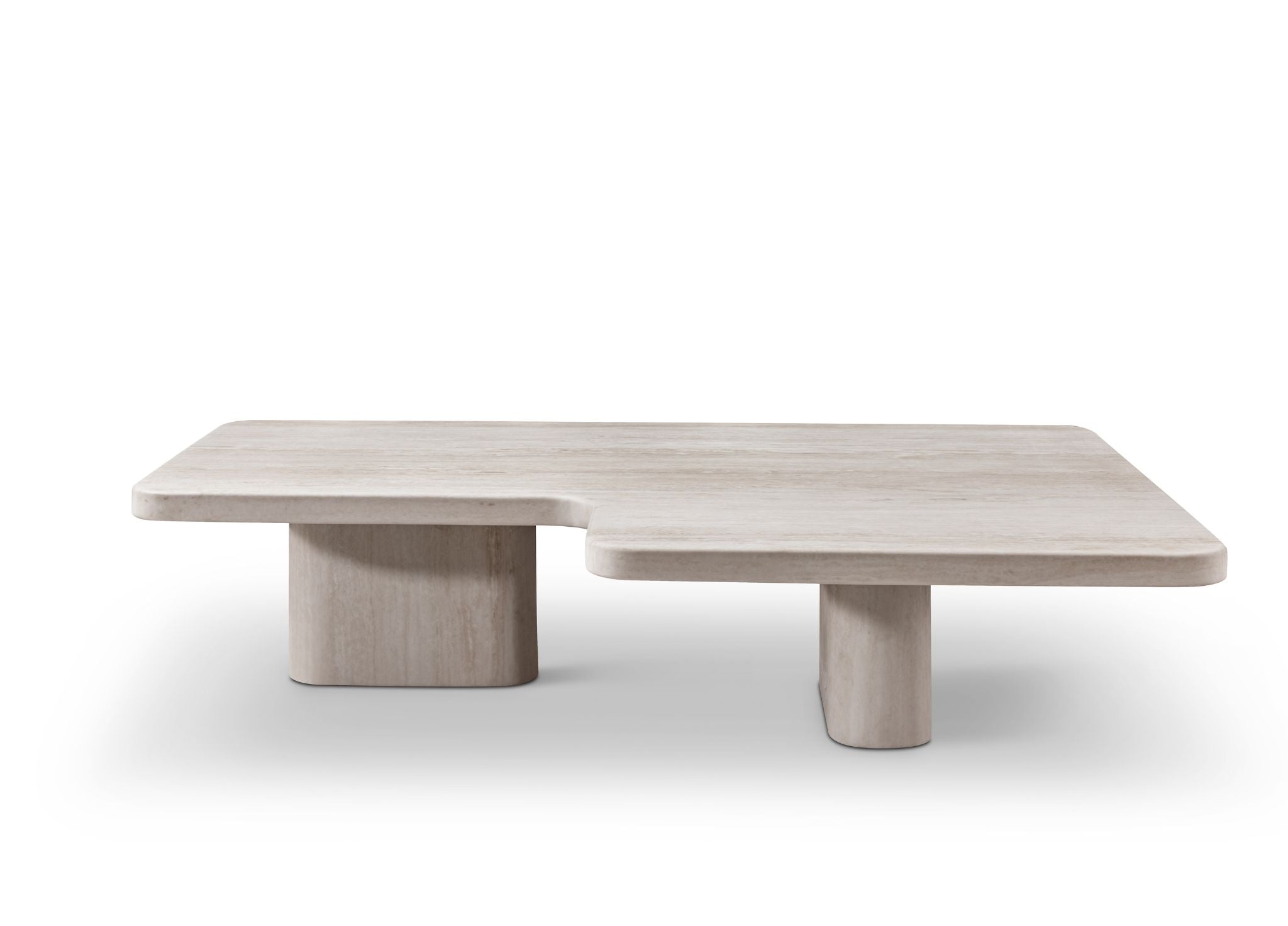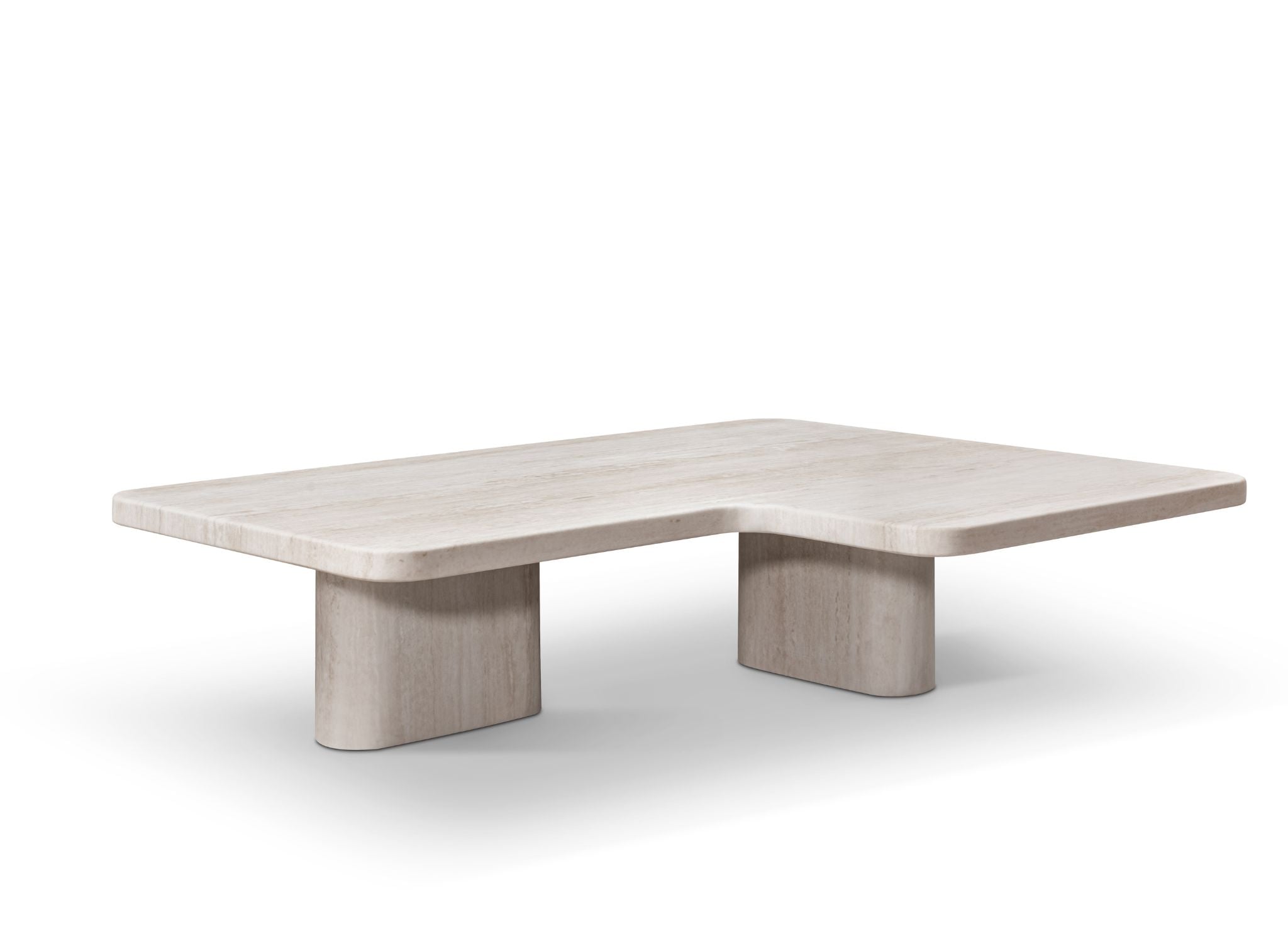 The Mosaic Coffee Table Is A Masterclass In Geometric Balance And Sculptural Simplicity.Finished in Travertine Marble Matte, Its Distinct L-Shaped Silhouette Introduces A Modern Architectural Edge. Resting On Two Strong Pill-Shaped Pedestals, It Brings Timeless Character And Sculptural Presence To Living Rooms And Designer Projects.