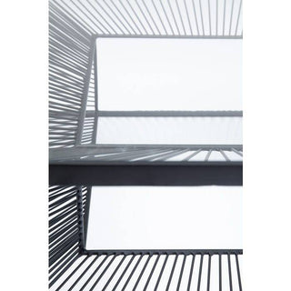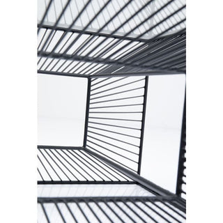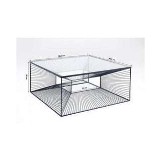 - Black coffee table with clear glass table top, which looks like a modern art object due to its graphic steel wire frame