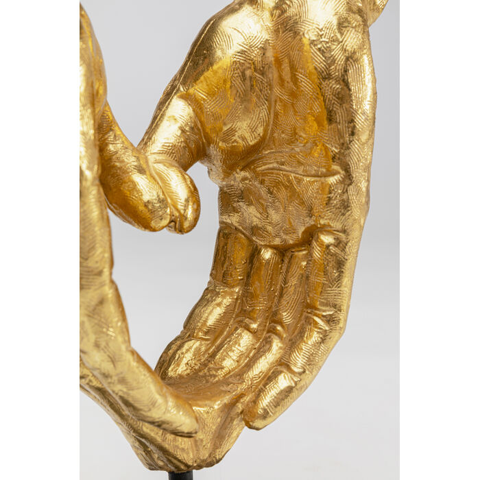 A symbol with style: this artistic decorative object in the shape of a heart combines an emotional message with elegant design. Two delicately crafted hands form a heart – completely in shiny gold and presented on a black steel base. The contrasting combination creates an expressive look that enriches modern living spaces with an extra dose of emotion. Whether as a highlight on a side table, stylishly displayed on a chest of drawers, or as an eye-catcher on a shelf, this object attracts attention and adds a loving touch to any room. It also makes a perfect gift with heart and character.