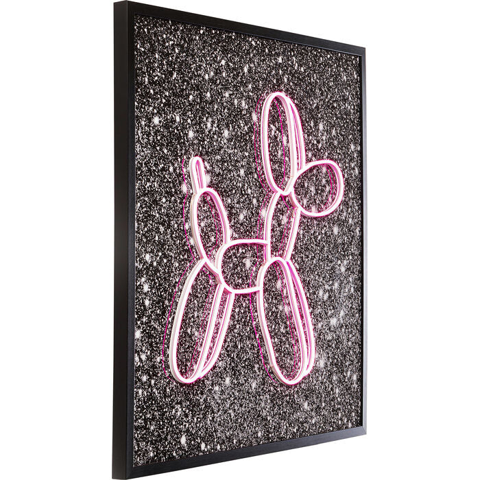 This is art for your gallery wall at home. The image of a dog in the style of balloon art has become a modern classic. Pink in colour, it shines against a black and glittering background with the look of neon objects. Fitted hooks make it easy to hang, so all you have to do is plug the cable into a socket and your new day can begin in bright colours. 230 V, 50/60 Hz, illuminant make LED, number of illuminant 1, max. 4.8 watt, including illuminant, not replacable illuminant