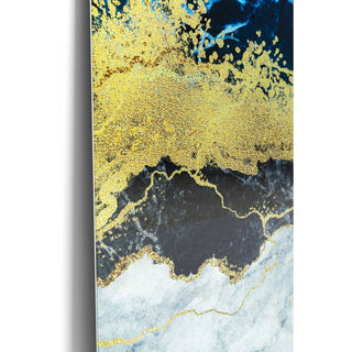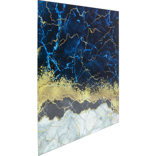 XL wall decoration with metallic effects: a large glass picture in square form measuring 100 x 100 cm. Abstract art in blue, grey, and gold, reminiscent of waves, sand, and beach holidays. Thanks to the hooks provided, the picture can be mounted in no time. The high-quality print behind toughened safety glass