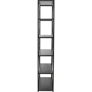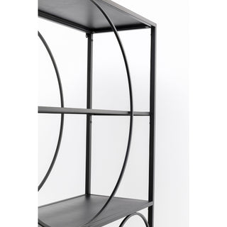 This imposing shelf unit with a height of 200 cm is definitely anything but ordinary! All in black in a modern and classic style, if it weren t for the circular steel rings that give the bookcase the proper breathtaking impact. A shelf unit with designer flair that will give your living room, study or even bedroom a character all of its own. Here you can let your imagination run wild with decorating ideas. In combination with plain, pastel-coloured wallpaper or a coloured wall you can bring out the best in this floor-standing shelving.
