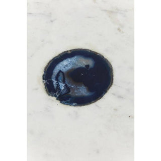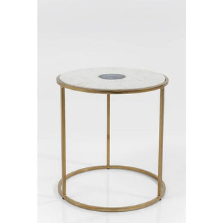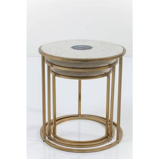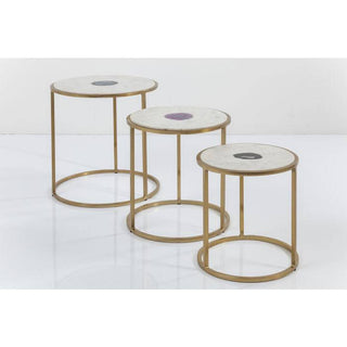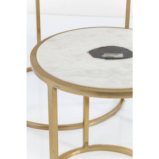 Set of three side tables in different sizes and designs. The high-quality marble top in which an exotic agate stone is embedded is particularly stylish. The top is supported by a frame in reduced styling made of gold-coloured, galvanised steel. Each table is unique.