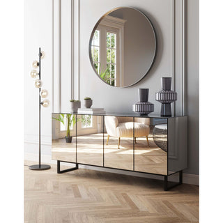- Mirrored sideboard sized 80x160x45 cm (H/W/D) with four doors and metal legs in black