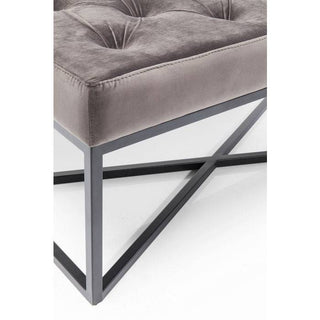 - Urban elegance: upholstered bench seat with elaborate button stapling, grey velvet cover and black lacquered frame.