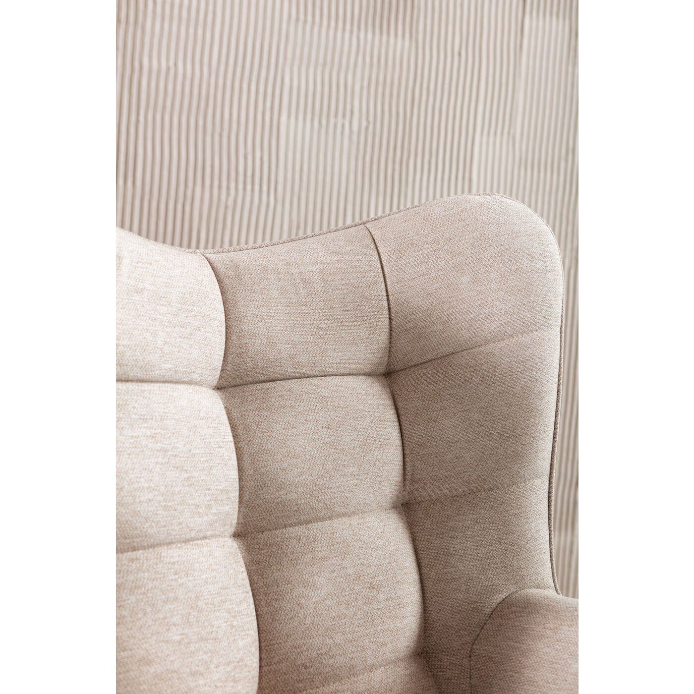- A beige swivel armchair with an ECO-TEX certified cover made of chenille fabric