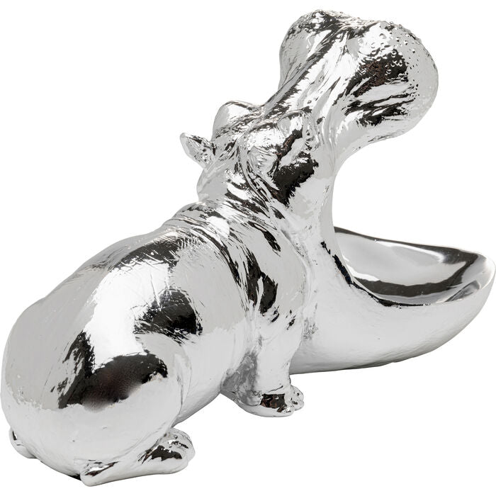 A touch of safari meets shimmering chic: this silver hippopotamus brings animal extravagance to your living space. With its reflective surface, the figure creates exciting light reflections and adds glamorous accents – whether on a console table, dressing table or as a sparkling highlight on a shelf. The flat back also serves as a stylish storage space for jewellery or everyday items. The silver eye-catcher is particularly effective in combination with glass, black or bold colours. A decorative statement with humour – and an original gift idea for anyone who loves the unusual.