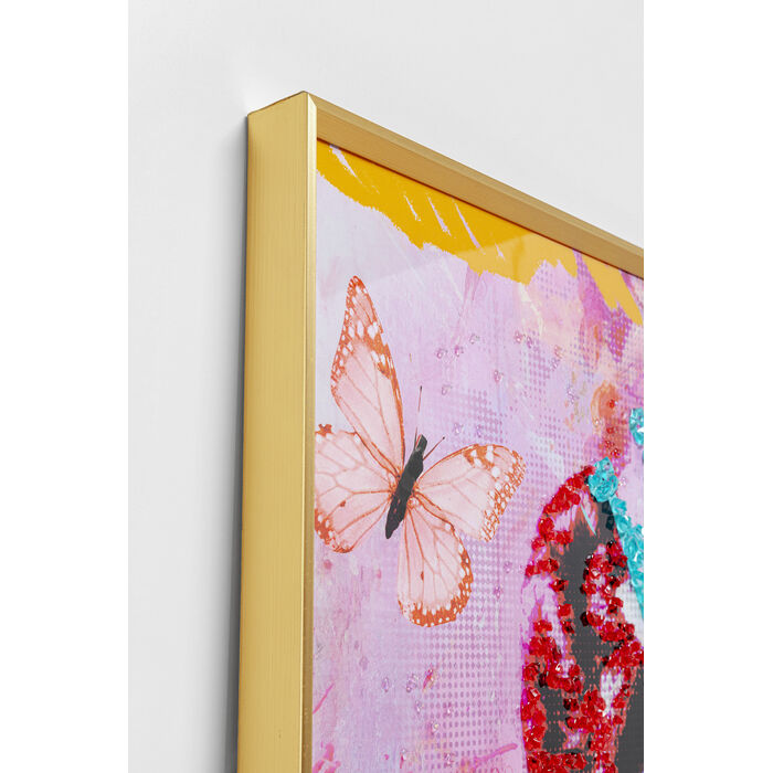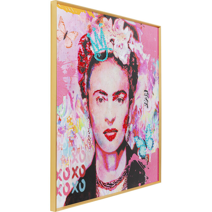 A real eye-catcher for anyone who has the courage to use color: This artfully framed glass picture shows the iconic Frida Kahlo in rich shades of pink - interpreted in a modern way and full of expressiveness. Glittering rhinestone appliqués add a touch of glamor, while the narrow frame in gold elegantly captures the motif. Expressive details, an exciting mix of styles and contrasting elements merge to create a pop art statement with a Mexican soul. Particularly effective above a sideboard, in a hallway or as the highlight of a gallery wall - combined with glossy surfaces or minimalist decorations, it creates an artistic ambience with the wow factor.