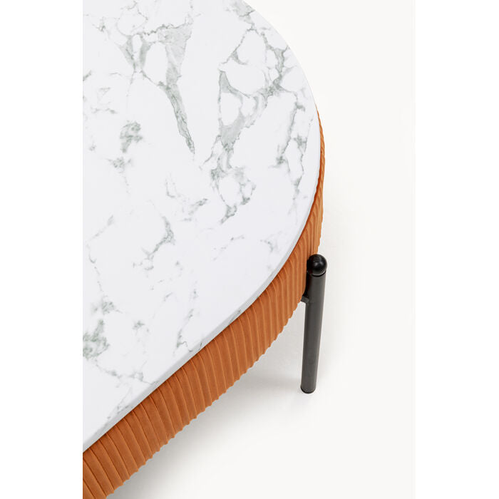 Its strikingly distinctive design makes this table for the living room and the sofa landscape stand out among its equals. It is characterised by a fine retro design with an Italian touch. The upholstered velvety cover of the corduroy-look body in a warm terracotta is also distinctive. The marble look is applied on durable MDF board. The advantage is that the aesthetics are classy, while the maintenance is easier than with natural stone. You can simply wipe this coffee table with a damp cloth and even a red wine stain won t bother it. This coffee table combines functionality and aesthetics in a harmonious and stylish way. With its generously sized top and additional storage space inside, it also offers enough space to make odds and ends disappear with ease.