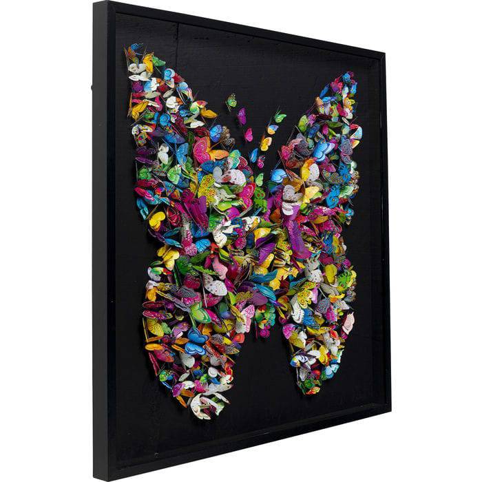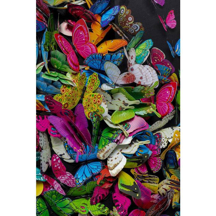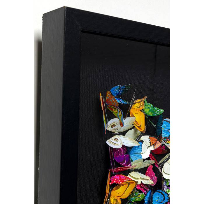 A colourful swarm of bright, exotic butterflies form a highly aesthetic, handcrafted work of art in this spectacular display case. Countless butterflies are placed on a night black background. With this object for the wall your apartment will acquire a touch of real gallery flair. Experience the beauty of nature in your home with this stunning display case. Carefully handcrafted, this piece features a vibrant swarm of exotic butterflies against a dark background for a truly eye-catching look. Instantly elevate any room with a touch of gallery-worthy art.