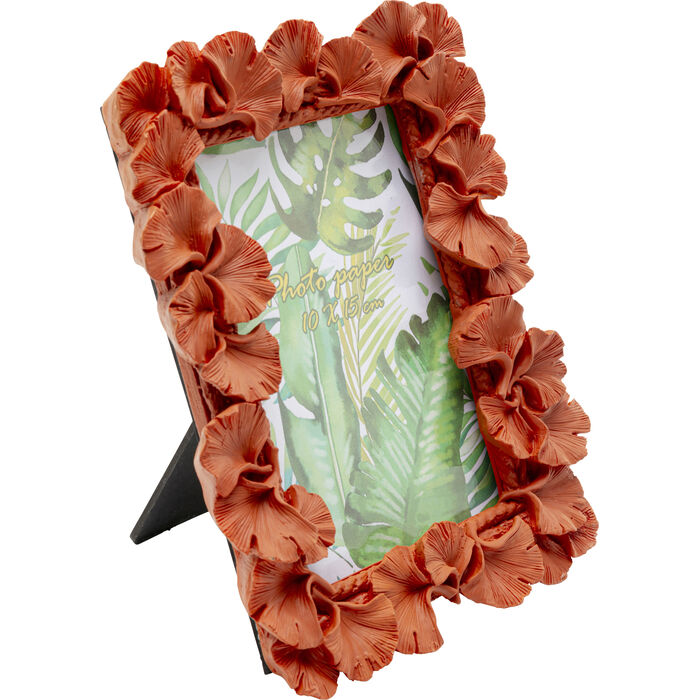 This picture frame features a striking border of stylized ginkgo leaves in warm orange. The symbol of the ginkgo stands for friendship, love and longevity and perfectly showcases personal memories or works of art. Made from high-quality polyresin and finished by hand, the frame adds a charming touch to any home. Ideal for adding a touch of elegance and meaning to a modern or nature-inspired room.