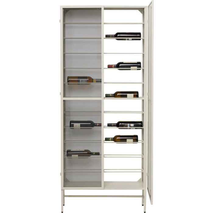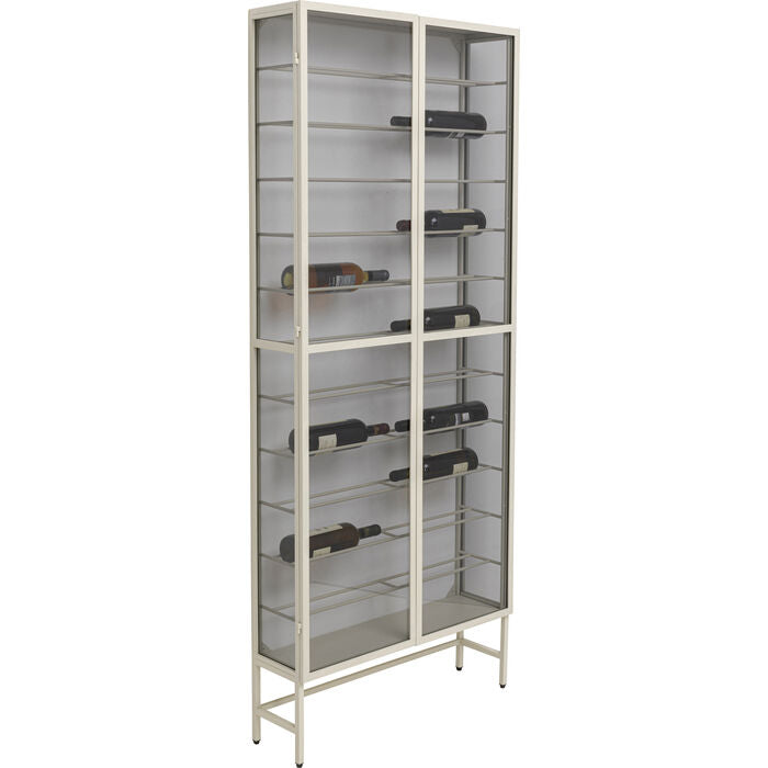 An elegant wine rack that combines functionality with urban style - perfect for discerning connoisseurs. The filigree steel frame in greige lends the design a modern lightness, while the lightly tinted glass doors present fine wines in style. The sophisticated design offers space for up to 24 bottles and blends harmoniously into minimalist or Scandinavian living concepts. Thanks to the practical push-to-open function, the doors open smoothly without any handles. Whether as a stylish home bar or a sophisticated eye-catcher in the living area - this piece of furniture combines design and function to perfection.