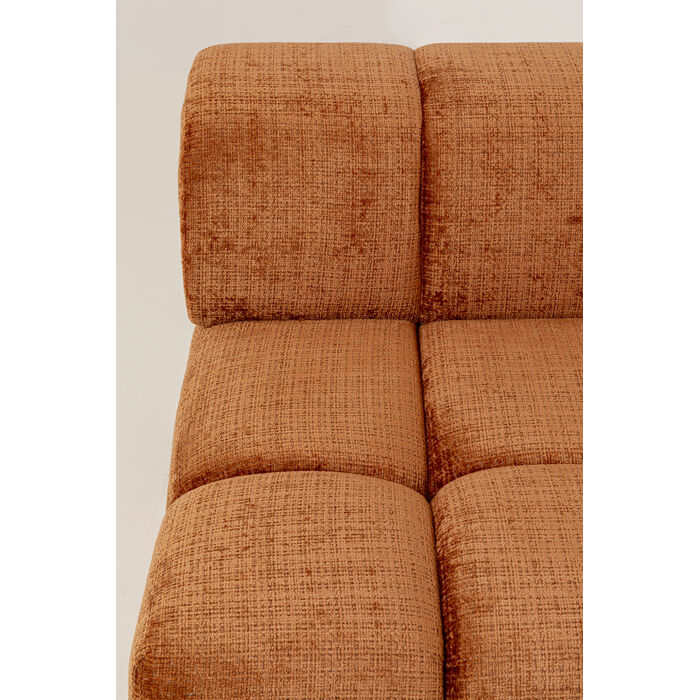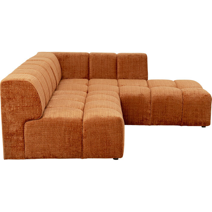 With its warm rust tone, clear lines and graphic design in a striking cube look, this corner sofa brings modern sophistication with a touch of retro charm to the living room. The velvety cover ensures a sophisticated feel, while the combination of soft upholstery, Nosag spring core and elastic belt suspension guarantees maximum seating comfort - perfect for long movie nights or relaxing hours with friends. As a stylish eye-catcher, the sofa can be ideally combined with golden accents, patterned cushions or a fluffy rug. It looks particularly harmonious in combination with natural materials such as wood, linen or rattan. A design highlight with a real feel-good factor.